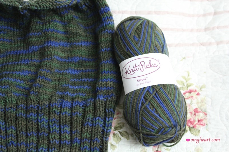 The Knit Picks Stroll Sock Yarn striped up really neat. Depending on the needle size you use and the size of your project, you will get delightfully unique and irregular striping! I only used about 1.25 balls.