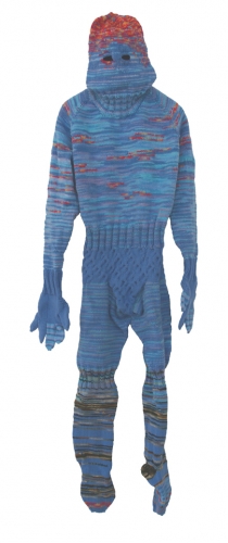 These characters are childhood memories of the ultimate man – the Dad every boy wants, the man every boy wants to grow up to be. My hand knit acrylic re-creations of these heroes’ costumes combine their heroic, protective, ultra masculine, yet vulnerable personas with the protective gestures of my mother – hand knit acrylic sweaters meant to keep me safe from New England winters. The costumes are life-size, my size, wearable objects that hang limply on hangers challenging the standard muscular form of the hero and offering the space for someone to imagine themselves wearing the costume, becoming the hero. They become the uniforms I can wear to protect my family from the threats (bullies, murderers, terrorists, pedophiles, and fanatical messianic characters) we are told surround us. —Mark Newport