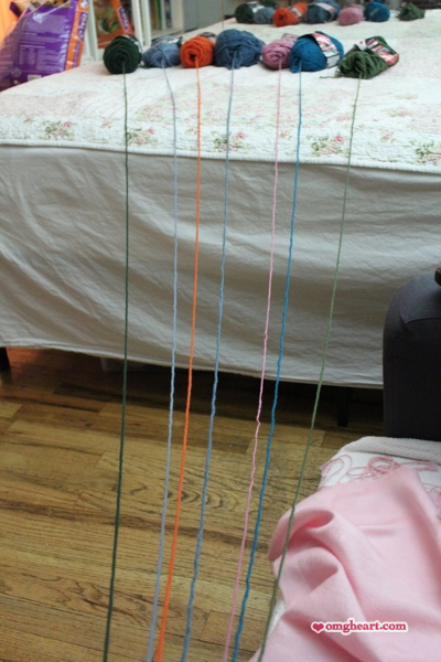 I made this mock big stitch rug as a dog mat/bed for my new puppy, Erica. It’s my do-it-yourself version of big stitch knitting without actually investing in specialty needles or yarns. The yarns and needles are expensive and hard to find. So rather than spring for giant knitting needles (I’d rarely use), I made do with materials and needles that are more commonly found in knitting shops and/or ones avid knitters might already have! All I did was use 7 strands of yarn together at once and jumbo sized knitting needles. That’s it. All those materials and tools can be found at your local craft store or yarn shop. Convenience and versatility.